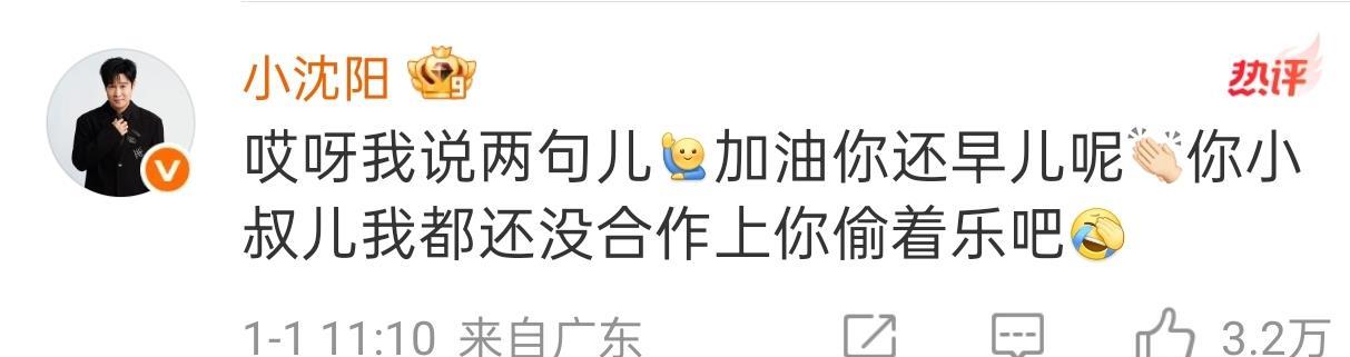 毛不易安慰完沈佳润后,小沈阳又现身评论区力挺沈佳润:“哎呀,我说两句,加油你还早儿呢,你小叔我都还没合作上,你就偷着乐吧。”