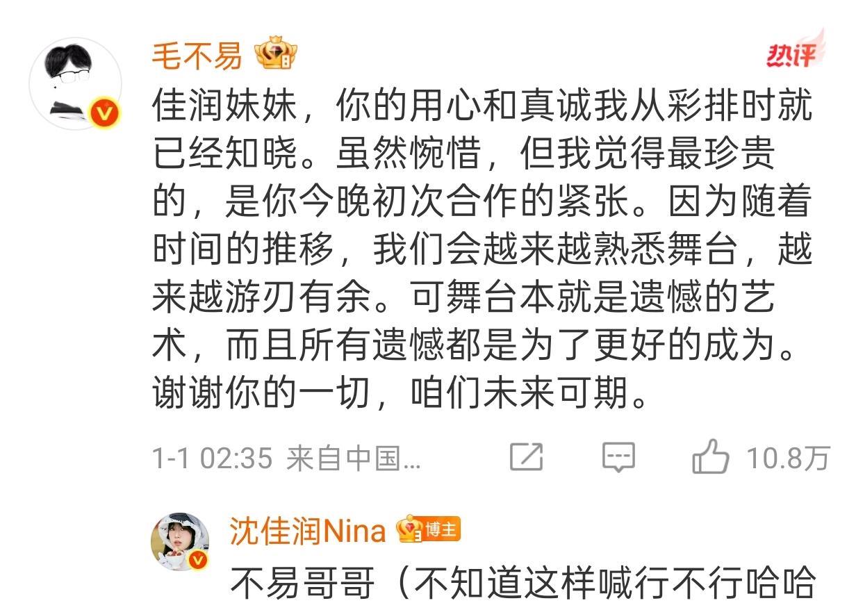 沈佳润道歉后,毛不易现身评论区发了一大段安慰她的话,说她的用心和认真他在彩排的时候就已经感受,虽然对结果有些惋惜,但这也是一段珍贵的经历,未来沈佳润一定会越来越游刃有余的。