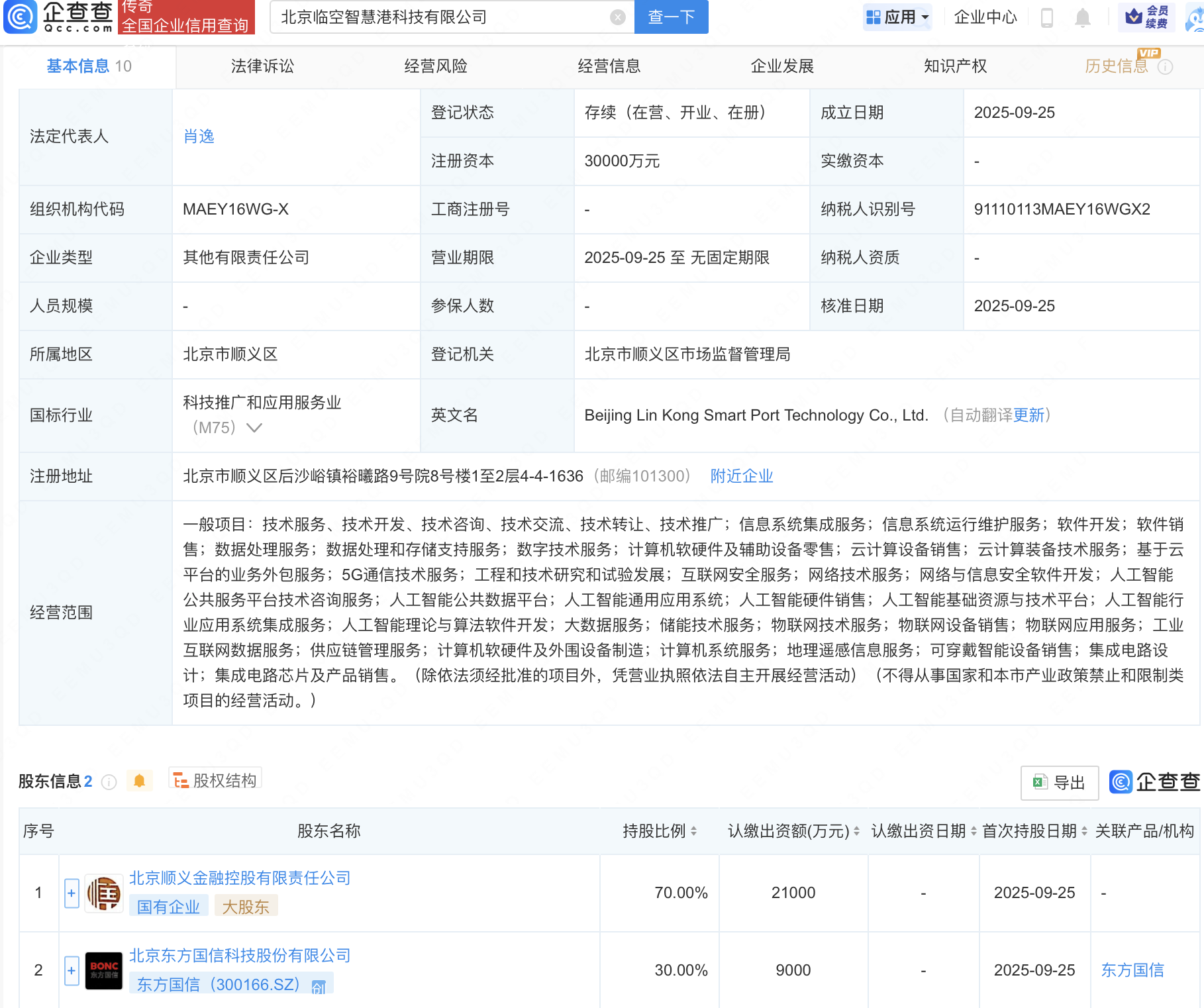 近日中金策略,北京临空智慧港科技有限公司成立,注册资本3亿元,经营范围包含:人工智能公共服务平台技术咨询服务;人工智能公共数据平台;人工智能通用应用系统;物联网技术服务;集成电路芯片及产品销售等。企查查股权穿透显示,该公司由东方国信(300166)等共同持股。